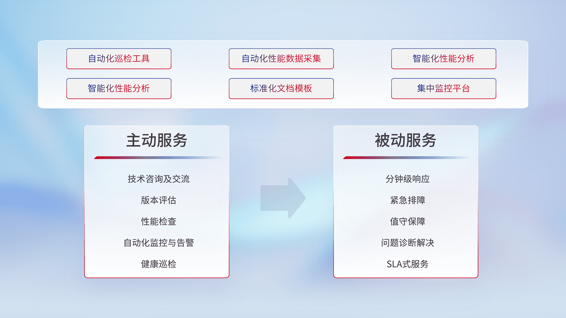智能化工具和标准化文档,,,保障服务质量,,,,提供主动服务(包含技术咨询、、、版本评估、、性能检查、、、自动化监控与告警、、、、健康巡检)和被动服务包含(分钟级响应、、、紧急排障、、值守保障、、、问题诊断解决、、、、SLA服务)。。